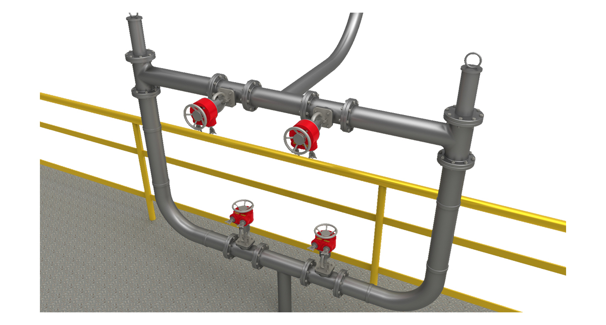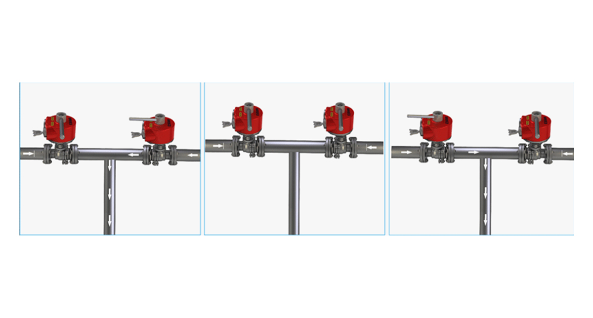 Illustrate from one media(right pipe) to another media(left pipe) by an simple valve interlock system, avoid combine two medium.